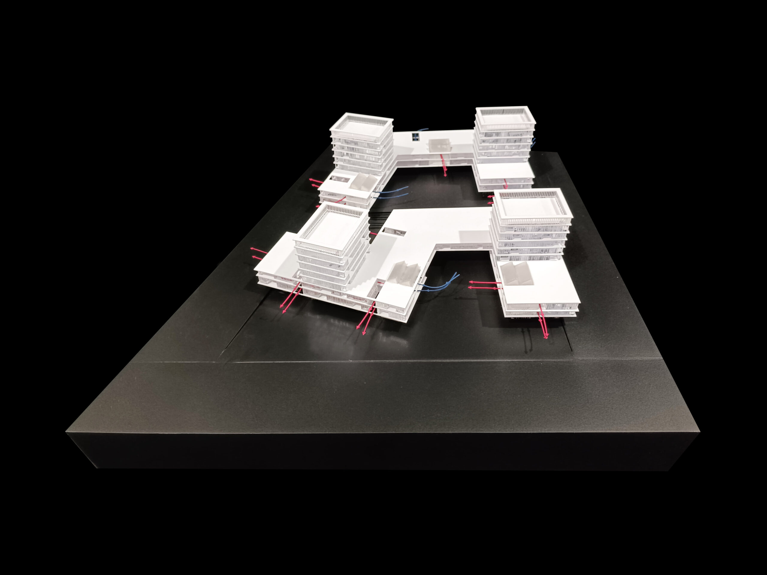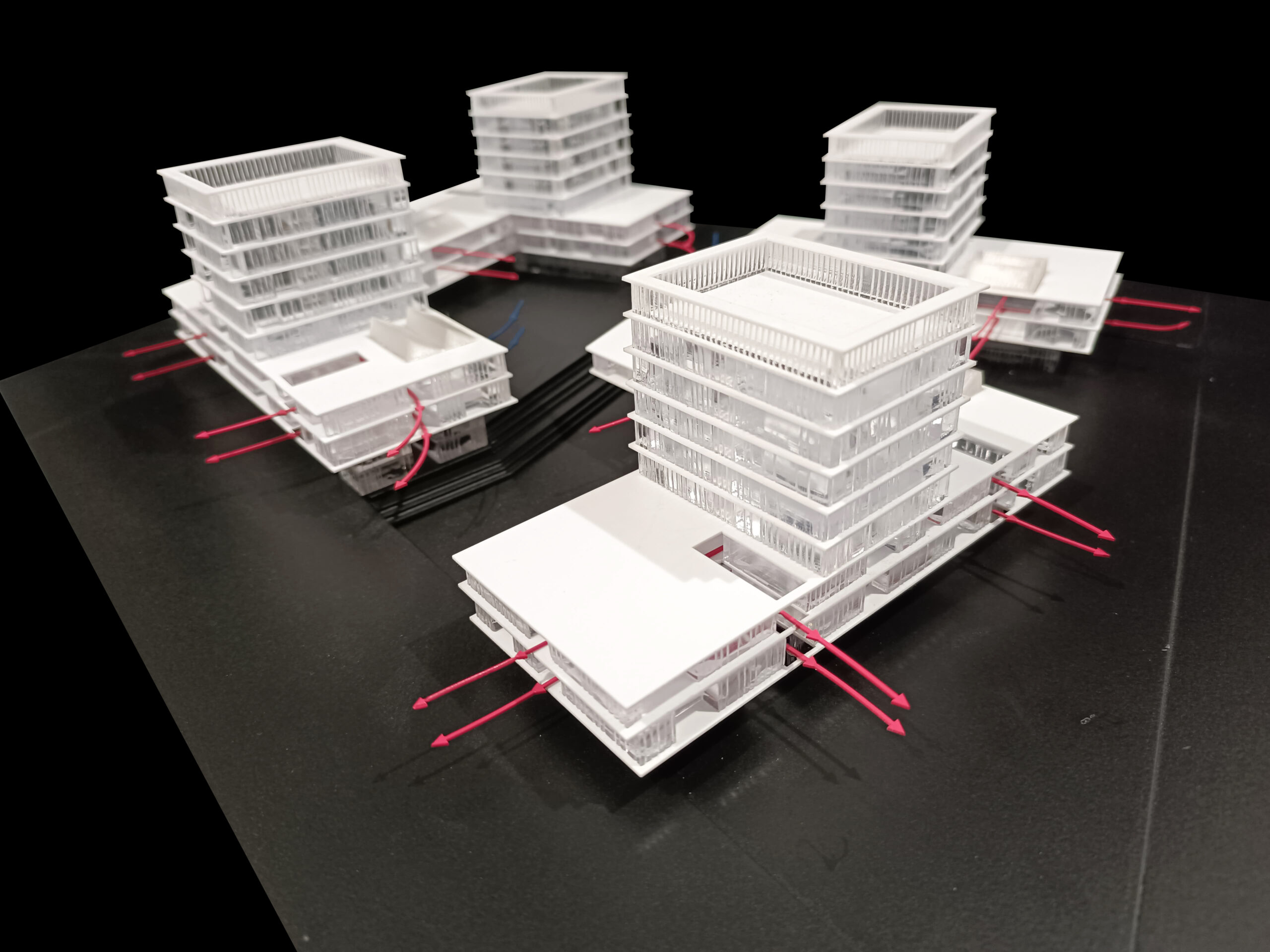 Debido a la gran profundidad edificada de los bloques de vivienda, se propone hacer una maqueta de metacrilato transparente que muestra lo que ocurre en el interior del edificio con una red de flujos de color que conecta los distintos de espacios públicos interiores que introducen el aire y la luz al interior del edificio: las toberas, corredores y condensadores.