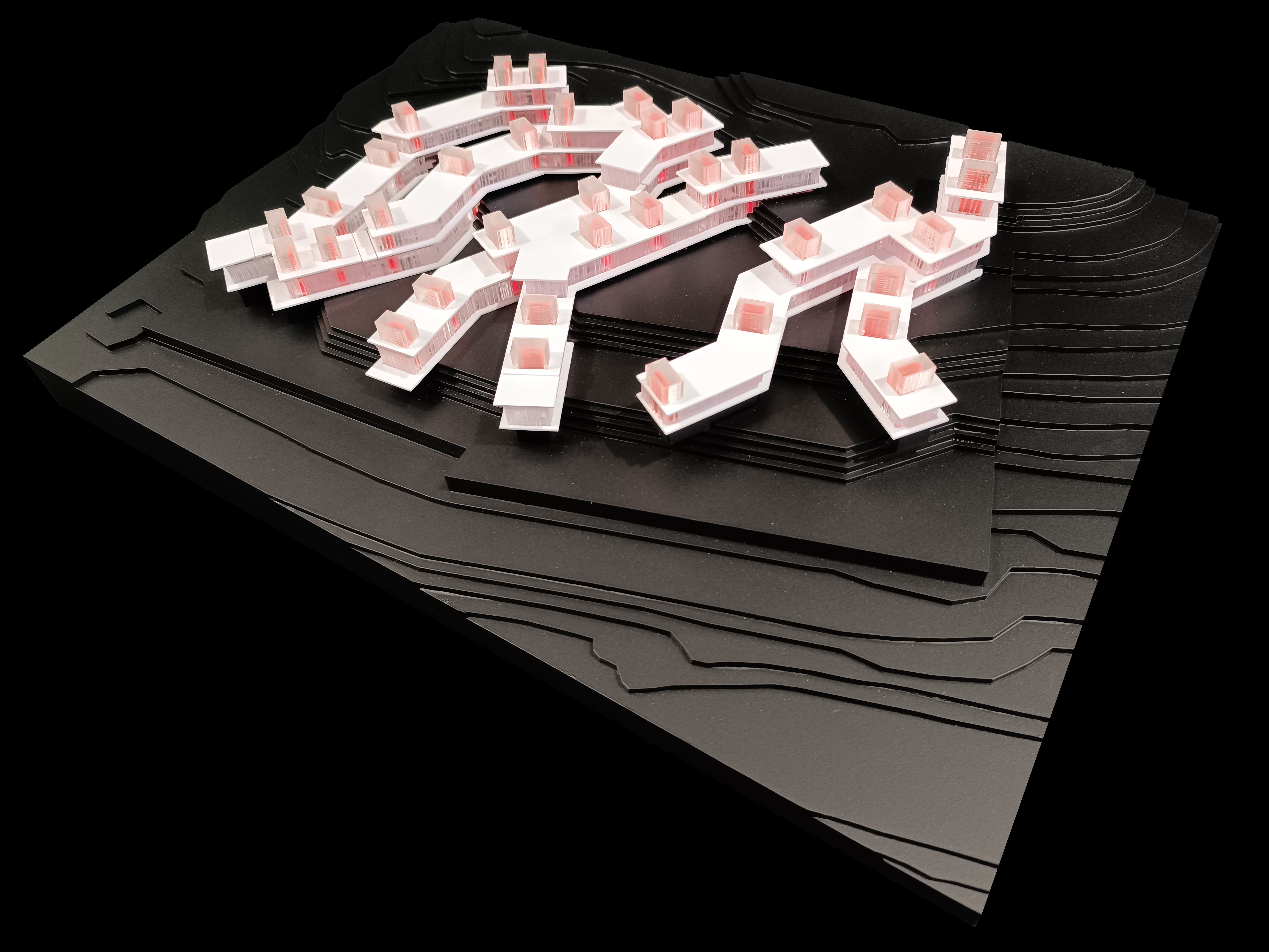 Esta maqueta trata de transmitir la voluntad del proyecto, posando varios elementos longitudinales que se adaptan a la topografía aterrazada del terreno y despliegan el programa habitacional sobre una base negra de curvas de nivel.