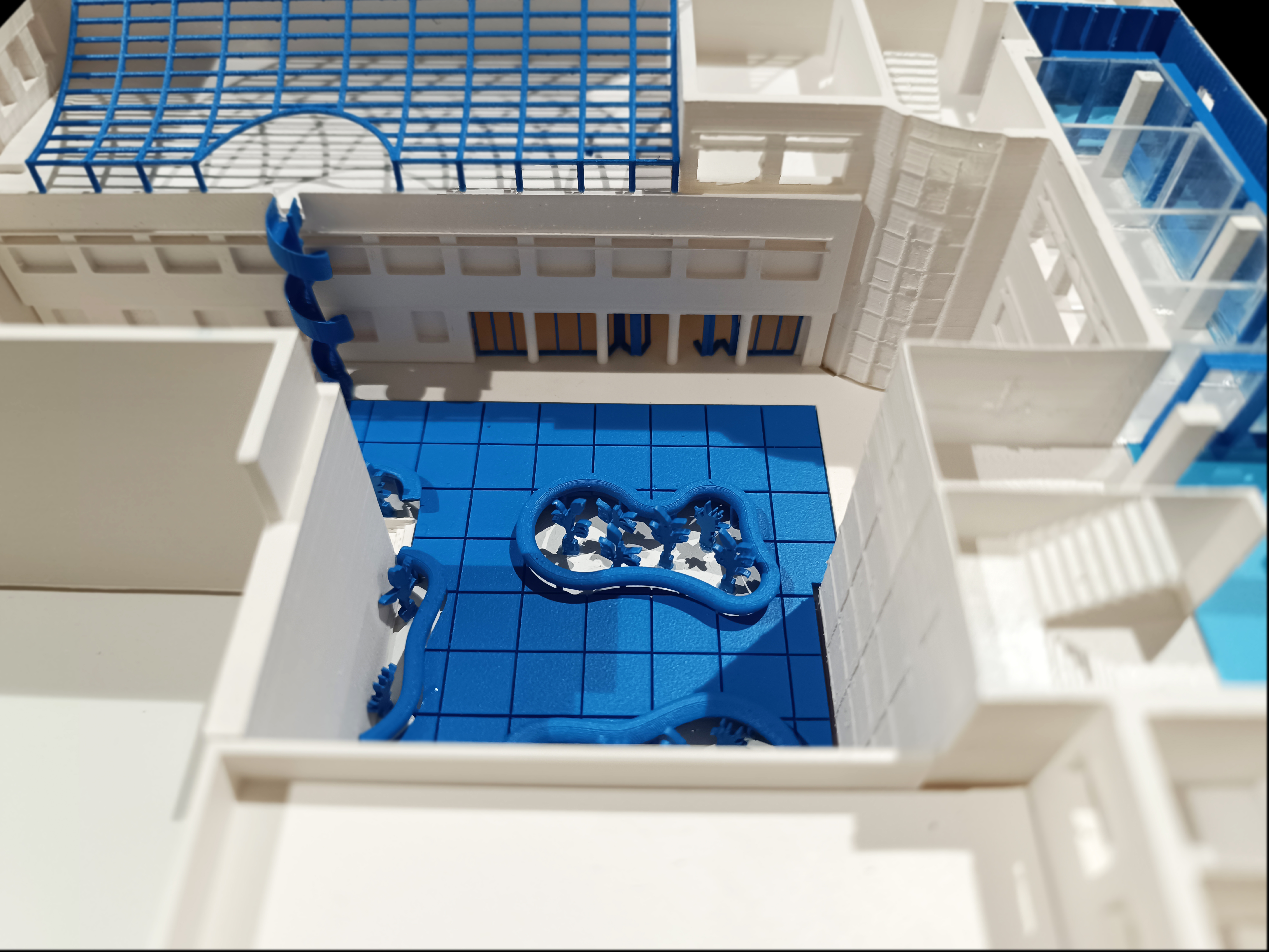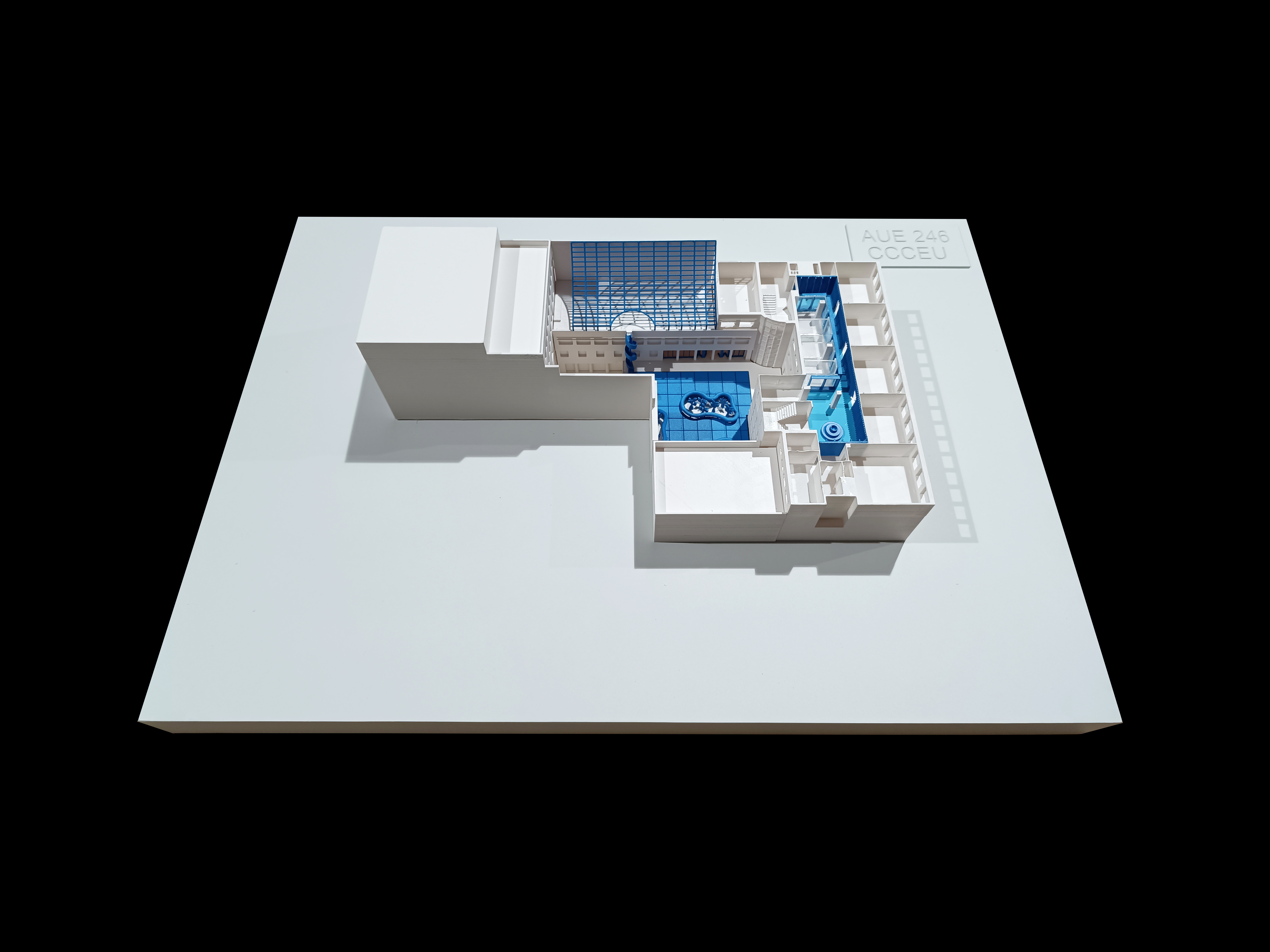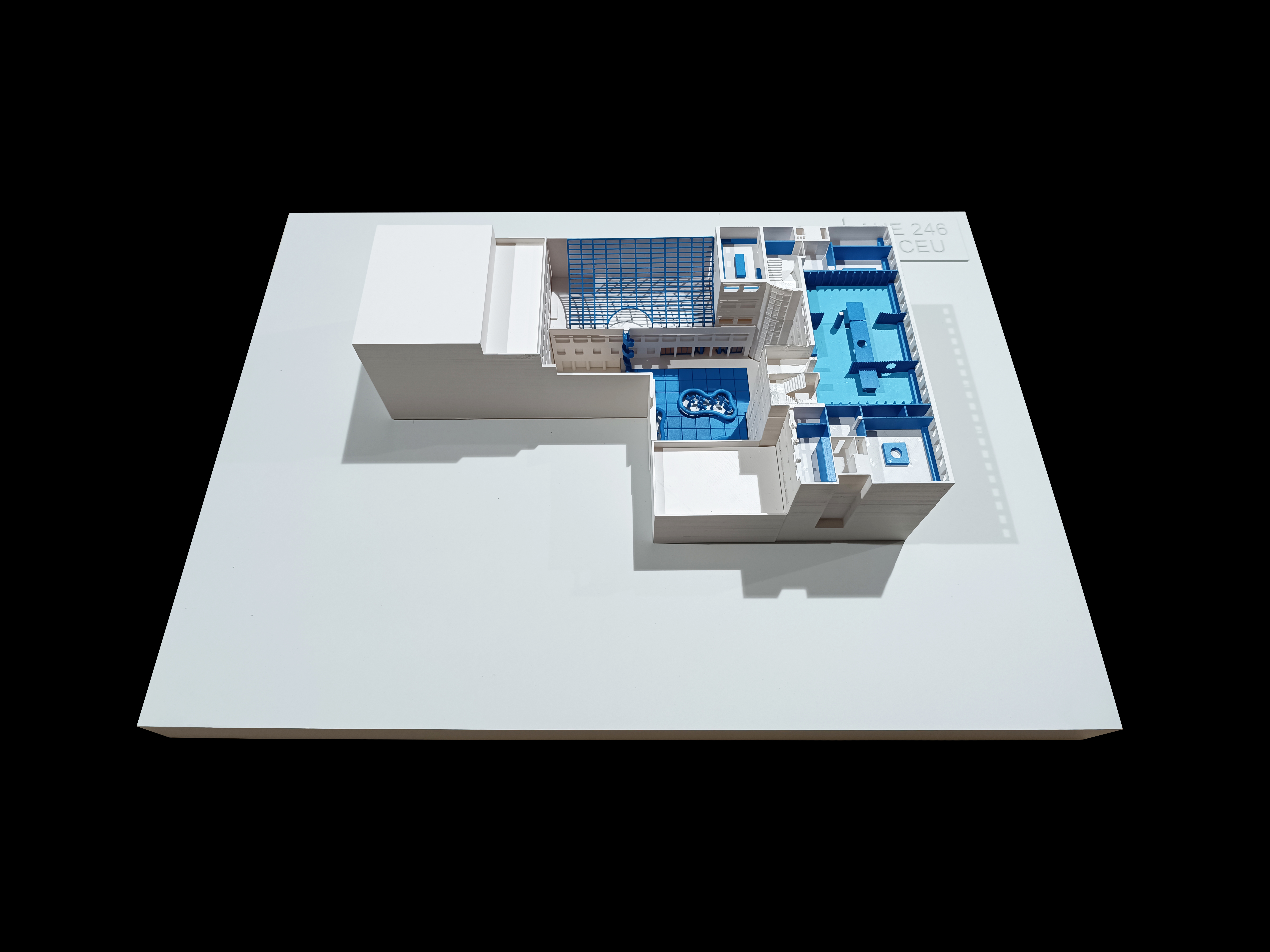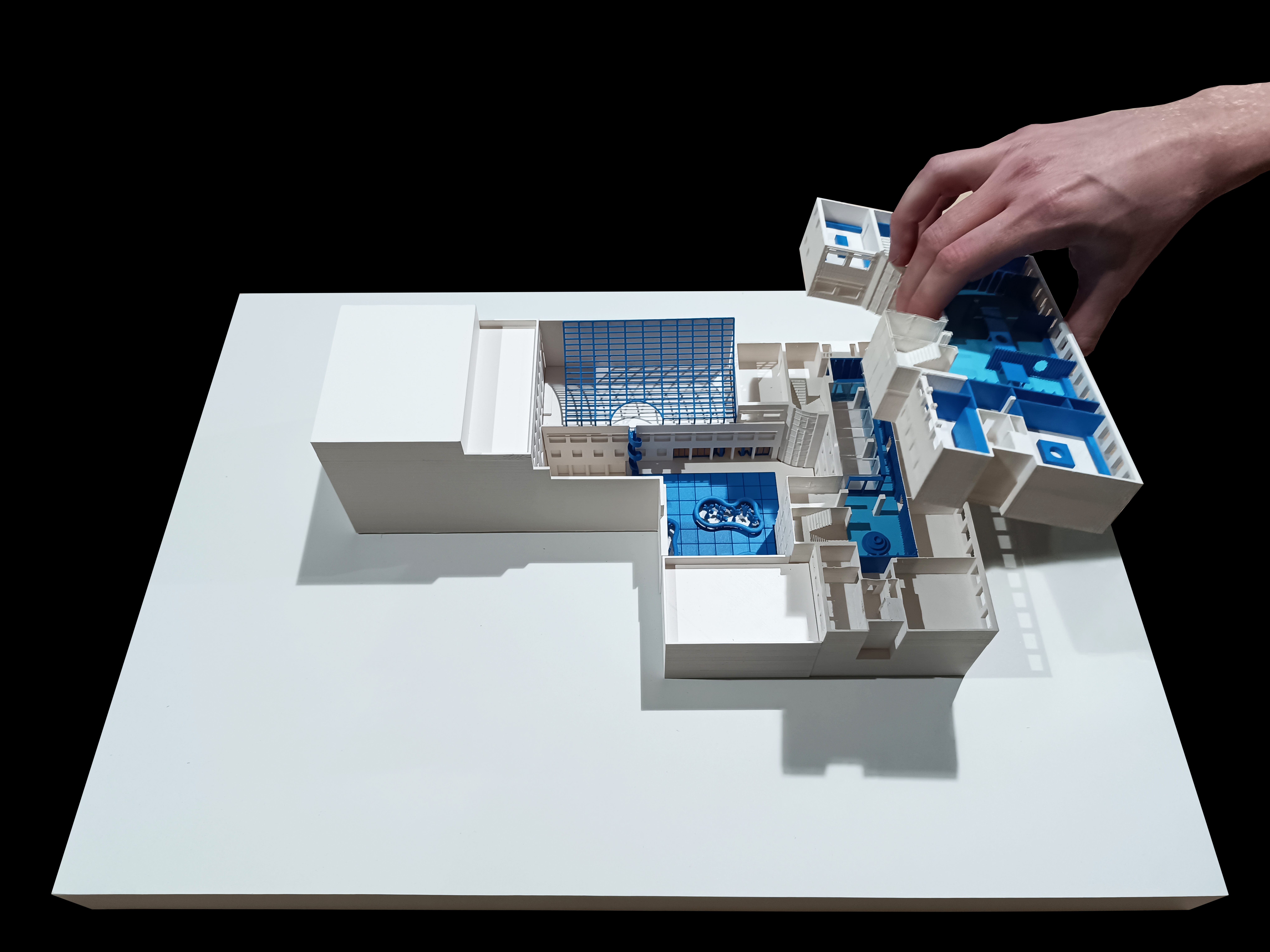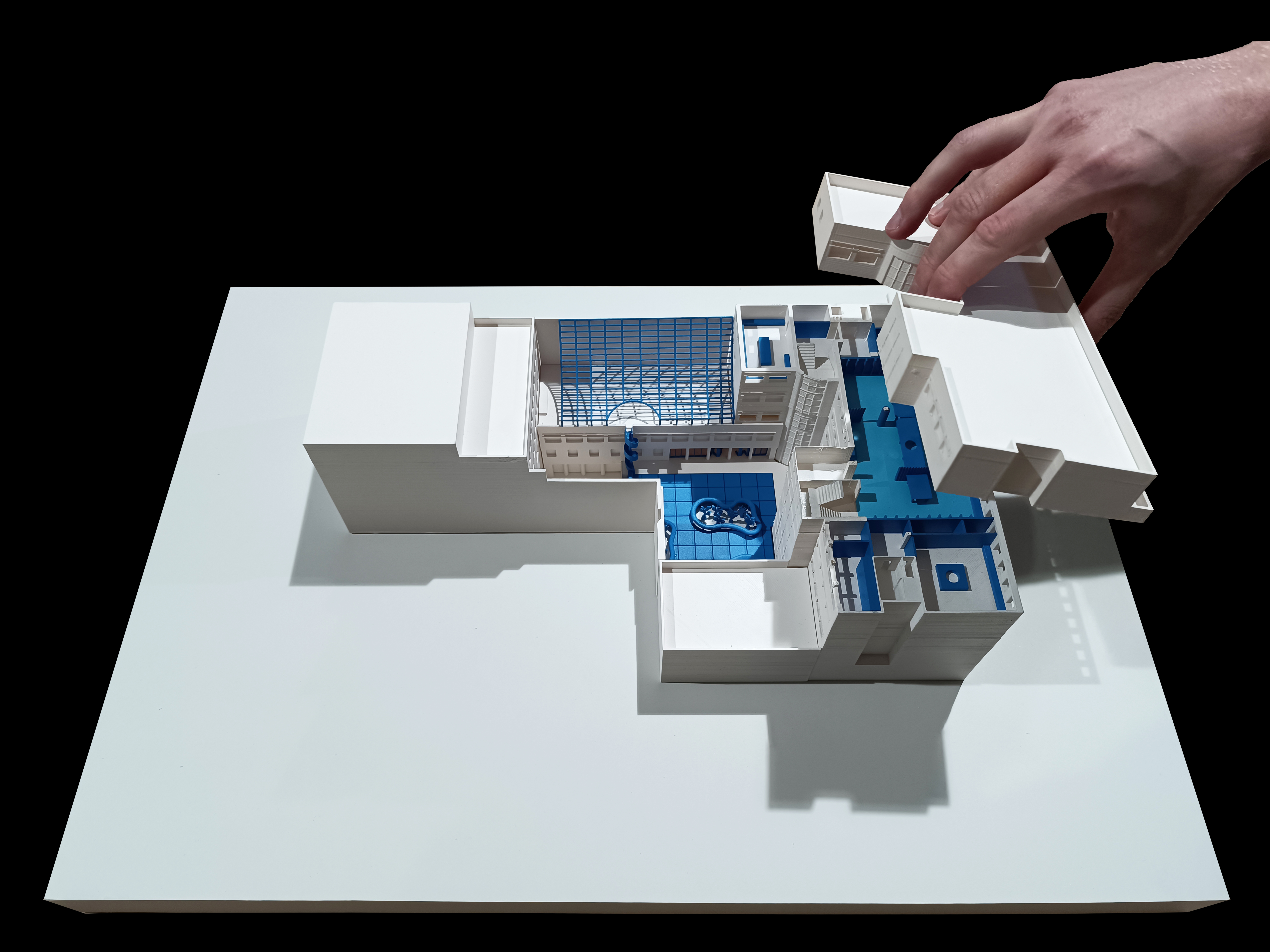 Se concibe una maqueta de secciones horizontales apilables e imantadas, para que puedan observarse las acciones e intervenciones del equipo de arquitectura sobre el edificio. Para ello se vuelve a configurar un marco neutro reproduciendo la geometría del edificio e introduciendo las variaciones o modificaciones del proyecto en elementos de color.