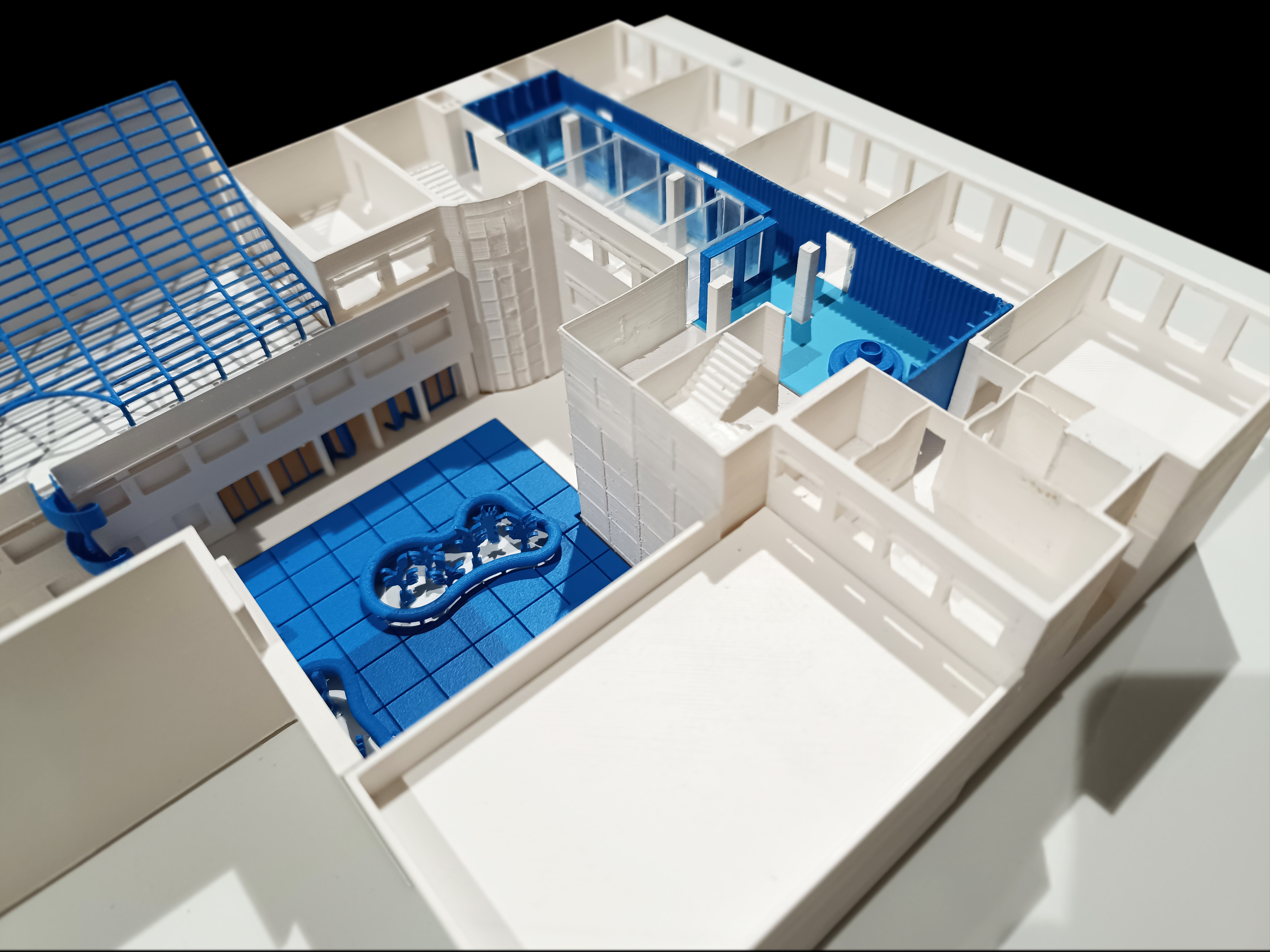Maqueta arquitectónica realizada para la exposición pública de un concurso en el que se iba a rehabilitar un edificio de oficinas y su patio de manzana.