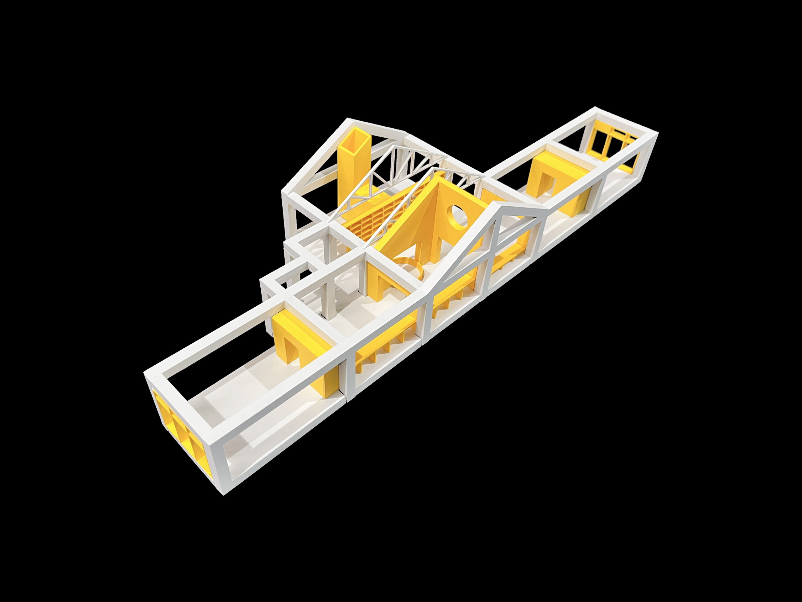 Por este motivo, se configura una escenografía general de carácter neutro que representa la estructura de la vivienda (solado, pilares, vigas y celosías) y sobre ésta se introducen elementos singulares de color (estanterías, armarios, chimenea, ventanas exteriores y bancos).
